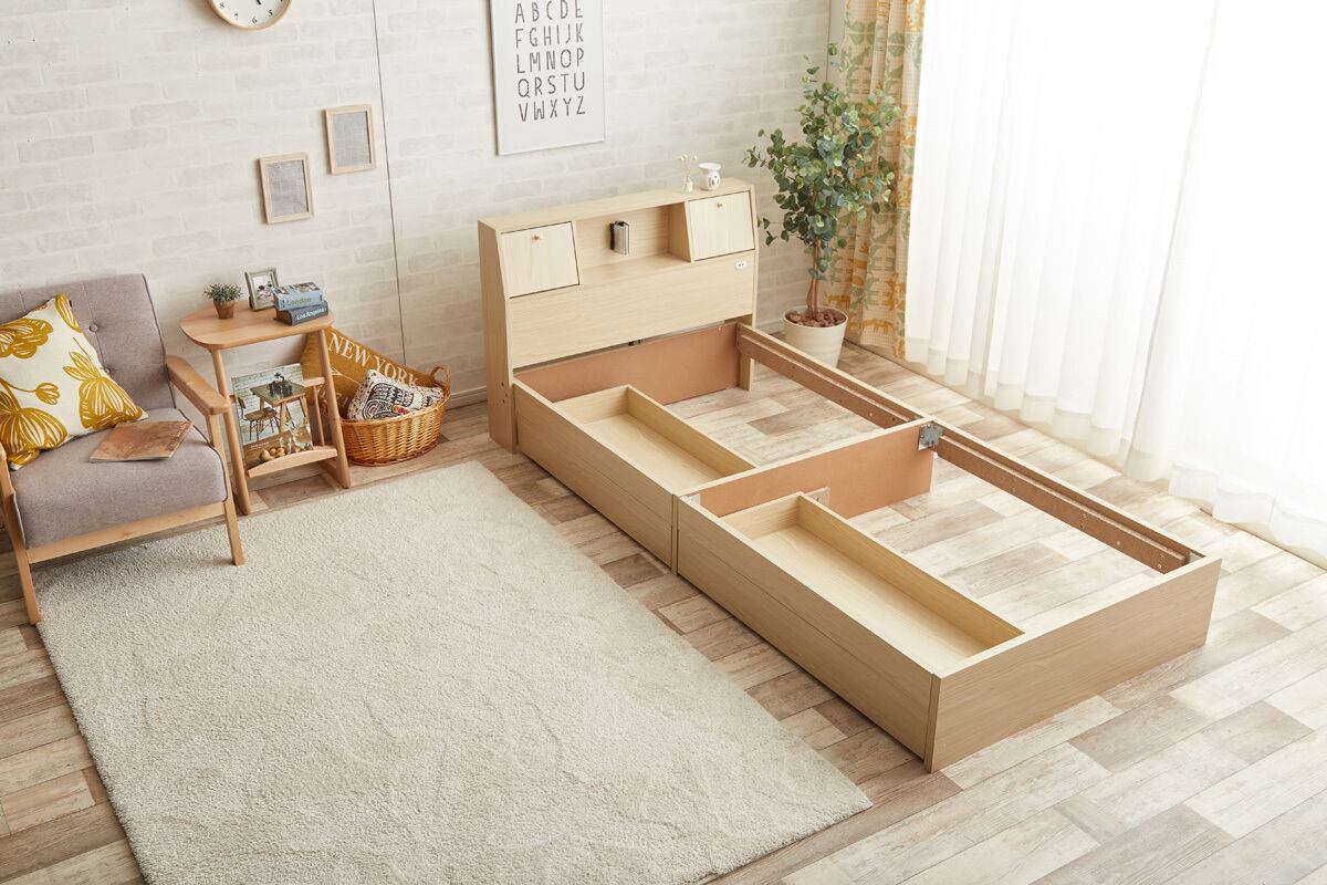 ヘッドボードに照明、コンセント、収納棚が付き、キャスター付の引出しまで付いた収納付ベッド。
