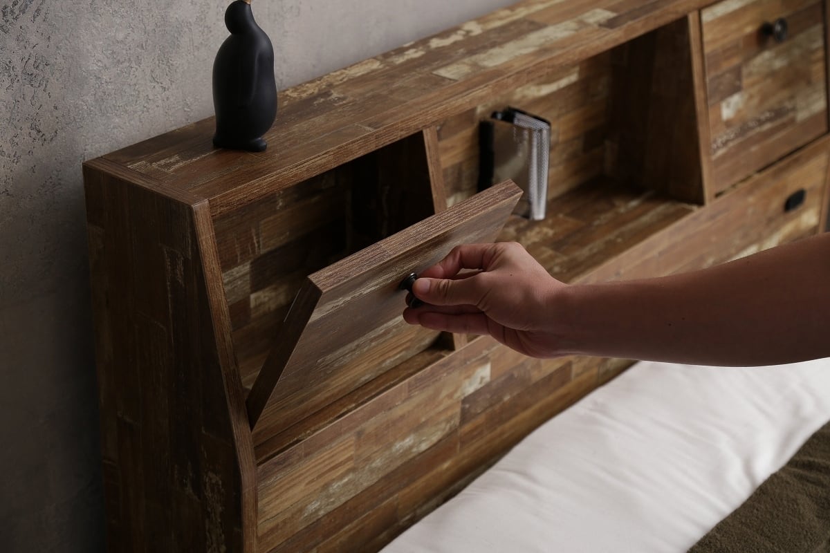 寄木柄を使用した「Cave 寄木柄引出し付ベッド」は、幾何学的な模様で存在感抜群の仕上がりです。