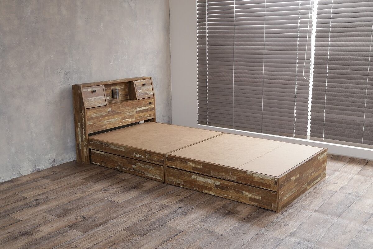 寄木柄を使用した「Cave 寄木柄引出し付ベッド」は、幾何学的な模様で存在感抜群の仕上がりです。