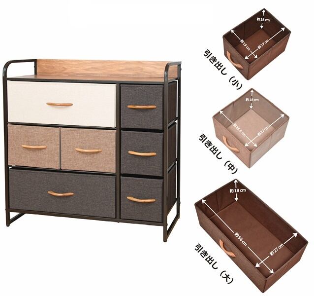 木目と布地がおしゃれでシンプルな布張りカラーチェスト、3段7杯ワイドタイプです。