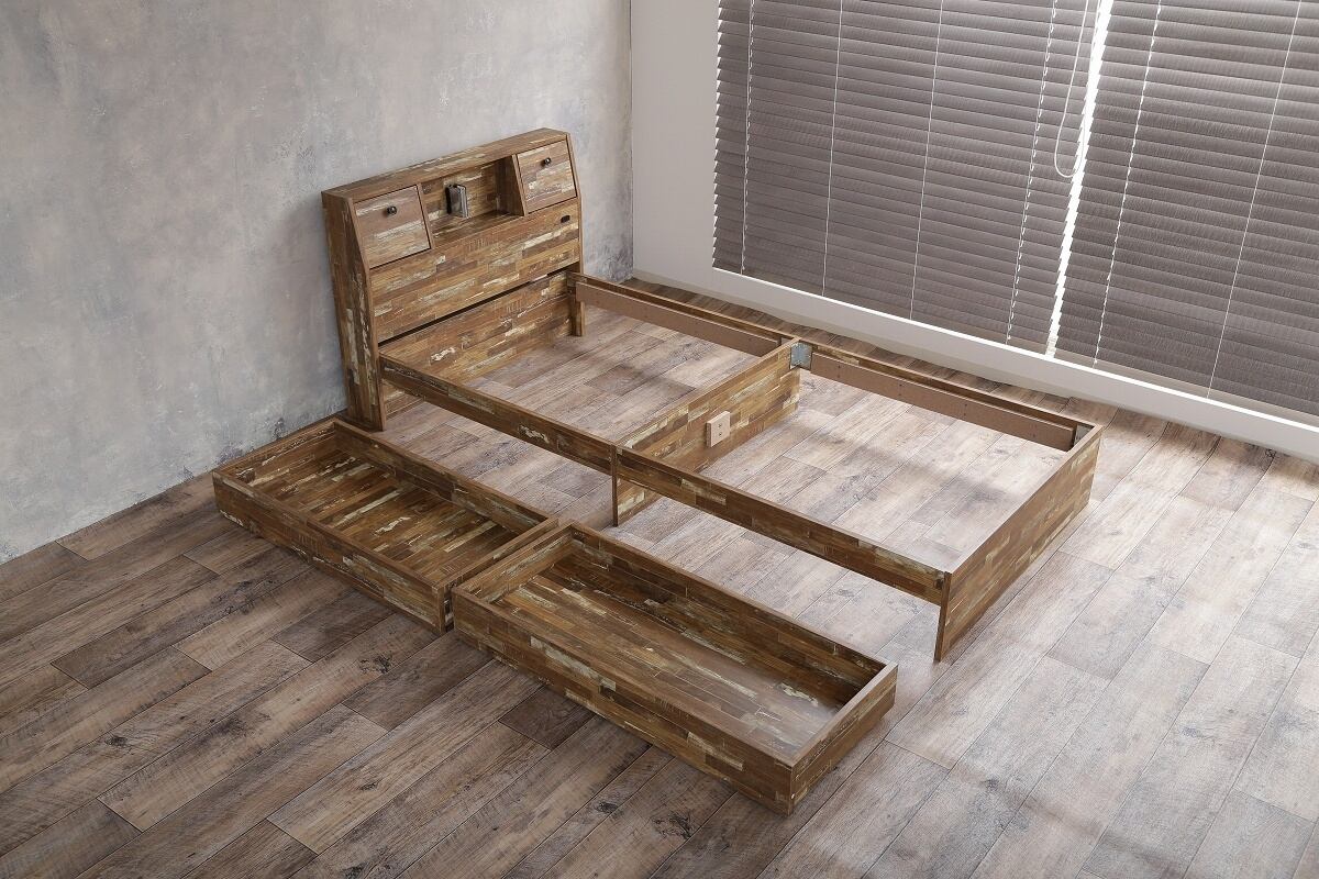 寄木柄を使用した「Cave 寄木柄引出し付ベッド」は、幾何学的な模様で存在感抜群の仕上がりです。