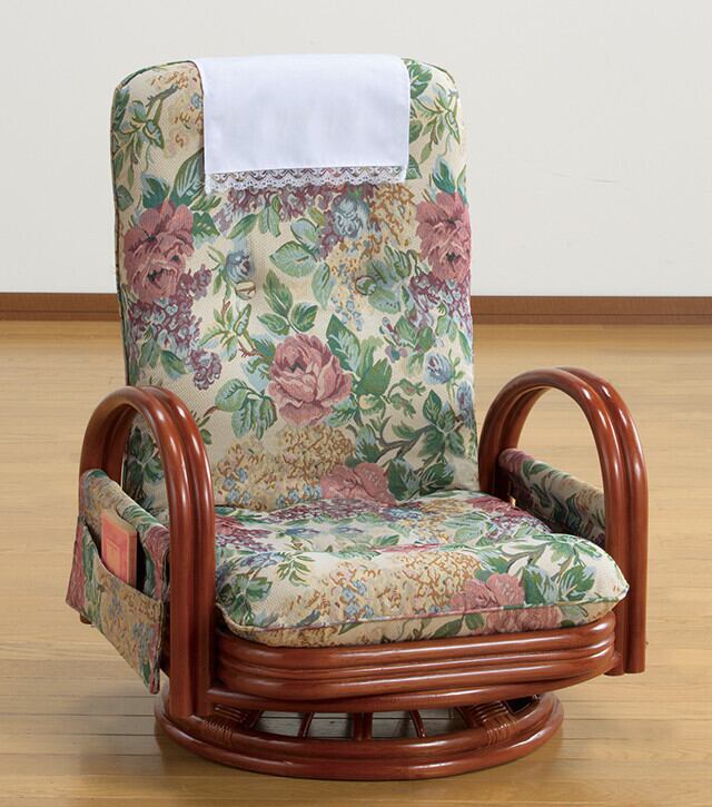 天然籐 籐製 ラタン リクライニング ハイバック 回転式 座椅子 サイドポケット付き