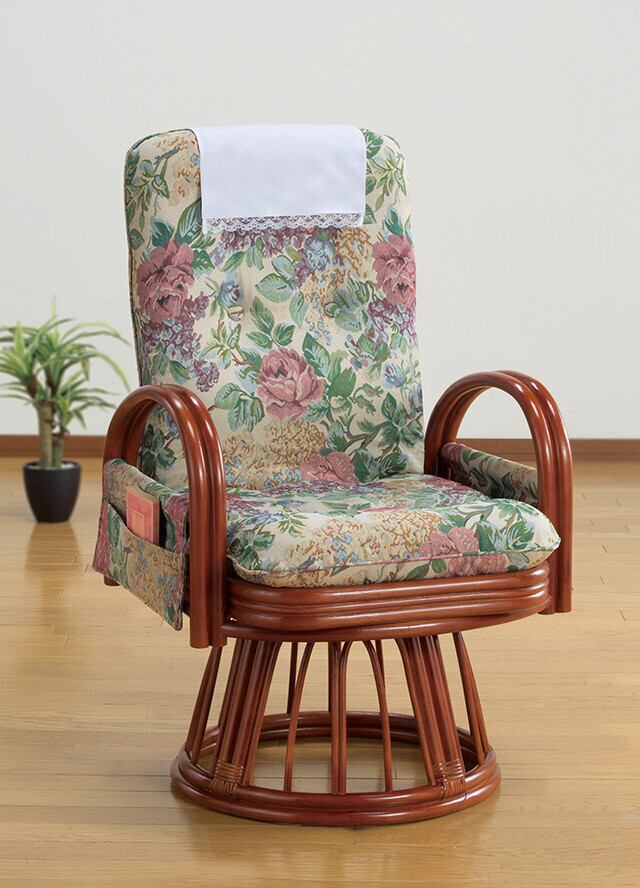 天然籐 籐製 ラタン リクライニング ハイバック 回転式 座椅子 サイドポケット付き