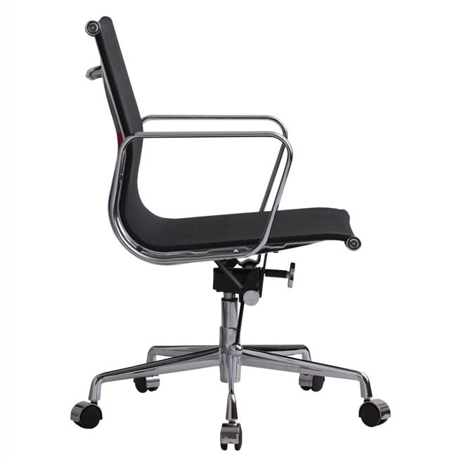 <商品について> ミッドセンチュリーを代表するチャールズ&レイ・イームズのアルミナムオフィスチェアです。当時の製品は、チルト機構(前後に傾く)でした。本製品は高さ調節機構がついており使いやすくなっています。チャールズ・イームズがラウンジチェアを期に、重量を軽減する為のアルミニウムを採用し、安定性を向上させるため5本足のデザインを取り入れましたが、この頃にアルミダイキャスト大量生産技術の開発され、実現した製品なのです。フレームは、すべてアルミダイキャストにクロームメッキを施しています。