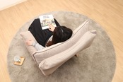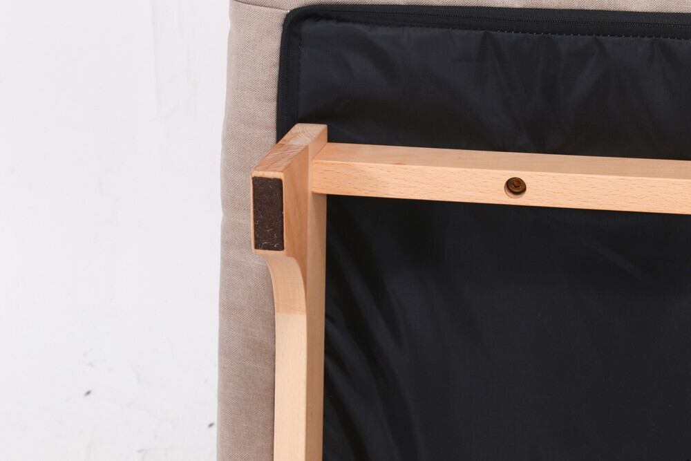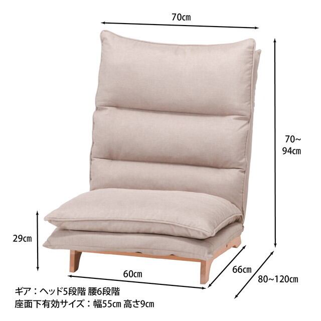 レバーで簡単6段階調節。体にフィットする心地良いお好みの角度に調節できます。ヘッドも細やかな角度調整が可能。〈br〉頭にフィットするヘッドレストや、フラットにして背もたれとしても使えます。首や肩の負担を軽減するハイバック仕様。〈br〉男性でもゆったりと寄りかかれます。ダブルクッションで座面はふかふか。ゆったりリラックスできます。座面下とダブルクッションの高さがあるので、立ち上がりやすいこともポイントです。夏はべたつかず、冬はひんやりとしない、ファブリック素材を使用しています。シート高さ290mm/構造部材:金属(鋼)/張り材:ポリエステル/クッション材:ウレタンフォーム/構造部材(フレーム):天然木/スチールパイプ/腰部レバー式6段階ギア+ヘッド部5段階ギア(KOYO)