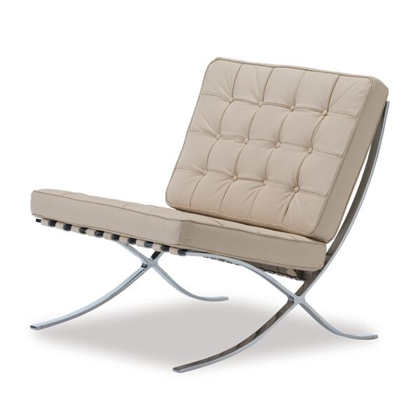 ミース・ファン・デル・ローエ の作品 “バルセロナチェア”です。1929年バルセロナ万博のドイツ・パビリオンを設計した際に、国王のためにデザインされた椅子であり、バルセロナチェアは20世紀の王様の椅子と言われています。 この作品は、古代の力の象徴とされていた“ハサミ”の形をモチーフとした脚部の偉大な美しさと、単純な形で最大の快適さを得ることを目的とされており、X形に組み合わされた金属フラットバーのフレームにクッションをのせるようデザインされています。彼の名言「神は細部に宿る」を体現した作品に仕上がっています。