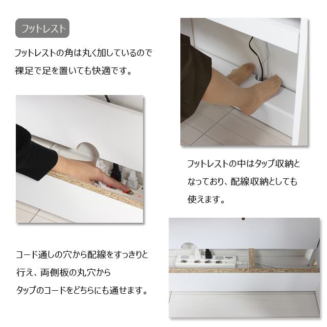 リモートワークも快適なフットレスト付!タップ収納にもなっており、配線もスッキリ収納できます。