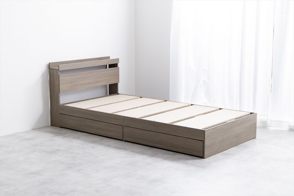 たっぷり収納付きベッド。便利な引出し収納が付いたシンプルなデザインの収納付きベッド。