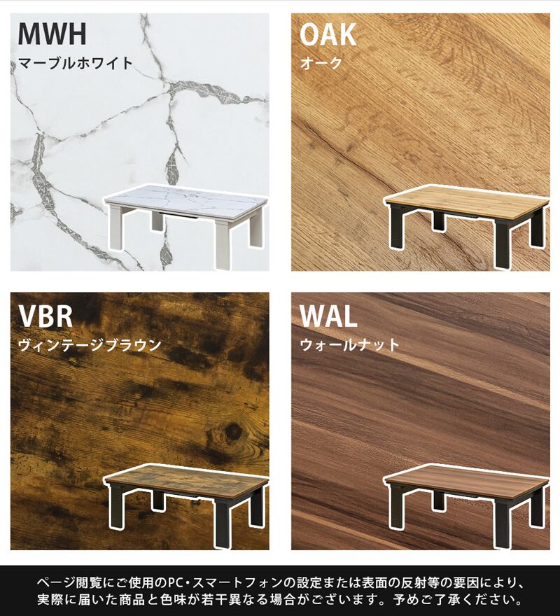 オーク(OAK)、ヴィンテージブラウン(VBR)、ウォールナット(WAL)、マーブルホワイト(MWH)の4色展開です